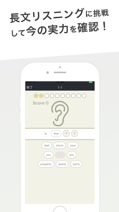 • ずっとリスニングに問題を抱えており(特に永遠特有の繋げて話すなどのルール)試行錯誤を1年間以上していました。このアプリを使い始めて1カ月くらい経ちますが、かなりリスニング力が上がって来た実感がないあります。ホントピンポイントで欲しい英語学習アプリでしたので本当嬉しいです。