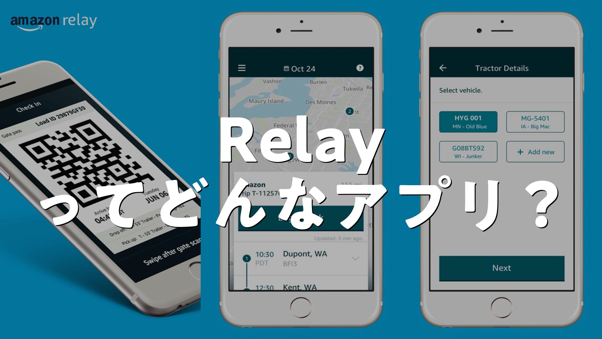 Amazon Relayはアマゾンに関する輸送を行うトラック運転手向けのアプリケーションです。アマゾン フルフィルメントセンターとソートセンターでの着車受付の時間を節約するのに役立ち、事前登録された受付に必要な情報をアプリ上に表示します。無料でダウンロードでき、QRコードをスキャンするだけで到着時の受付が簡単に完了します。運送会社からの招待コードで追加機能(運行の通知や管理など)が利用可能になる場合があります。