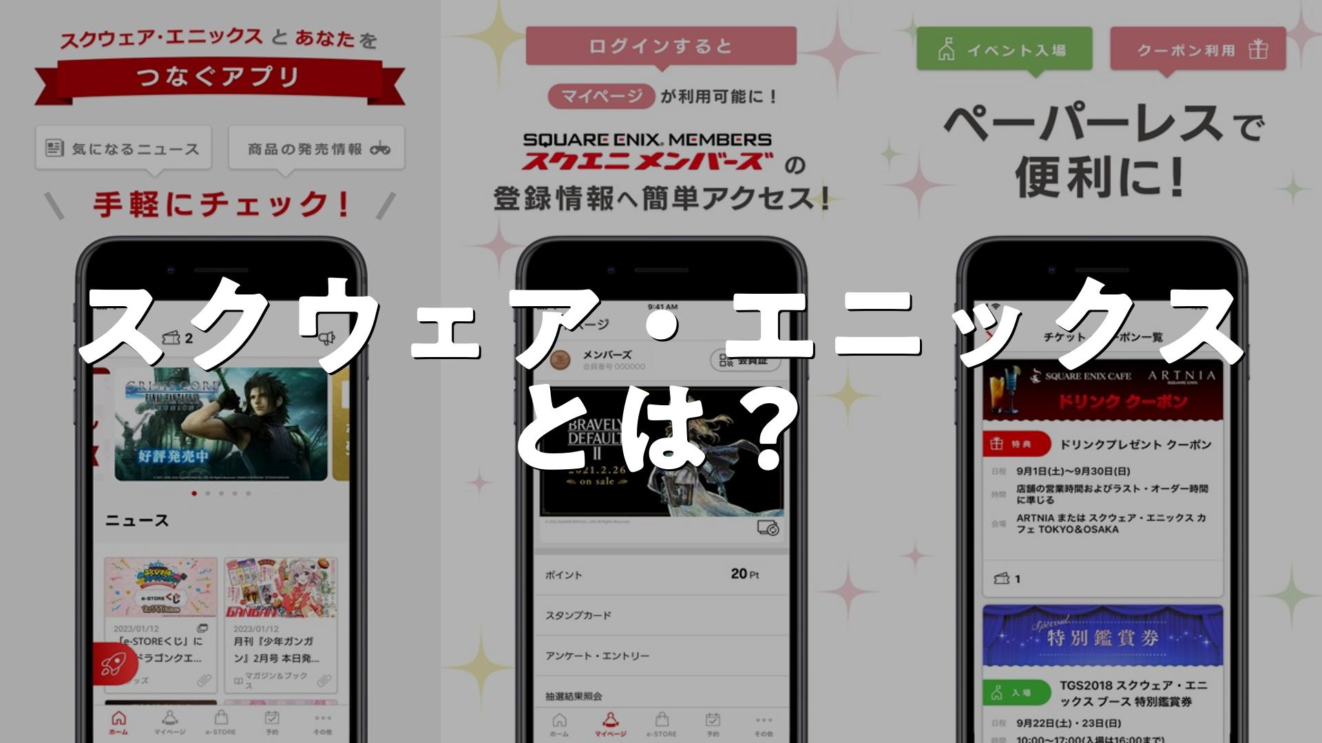 スクウェア・エニックス アプリは、スクウェア・エニックス公式のサービスをまとめて利用できるスマホ向けアプリです。ニュースフィードで最新情報をチェックしたり、公式EC「e‑STORE」での商品確認、スクウェア・エニックス カフェの予約や電子チケットの受け取り、会員証のカードフェイス変更など、ユーザーのスクエニ周りの体験を1つのアプリで便利にすることを目的としています。会員向け機能を使うにはスクエニ メンバーズへの登録が必要です。