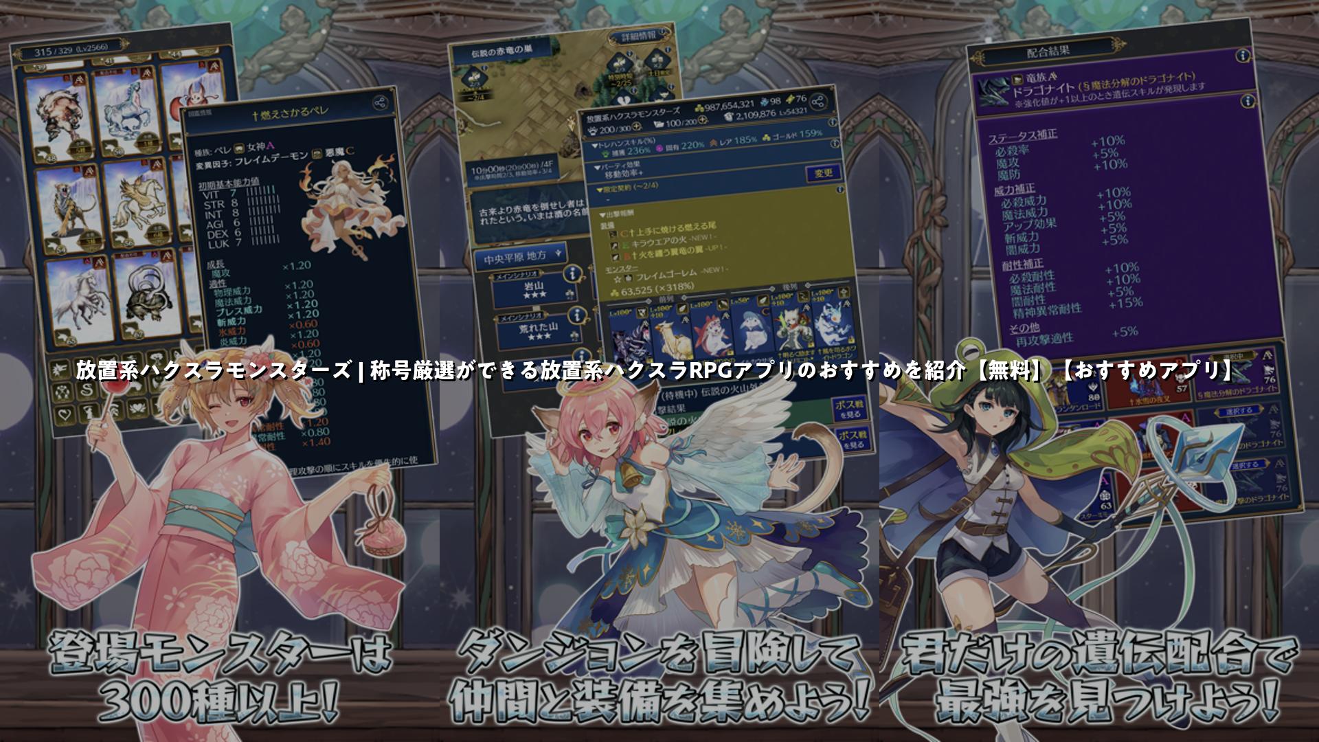 放置系ハクスラ「放置系ハクスラモンスターズ」は、装備やモンスターに付く「称号」を厳選して自分だけの最強ビルドを作るやり込み向けRPG。放置で育成が進み、スキマ時間に成果確認して強化を繰り返す遊び方が魅力です。課金要素はあるものの無課金でも遊べます。