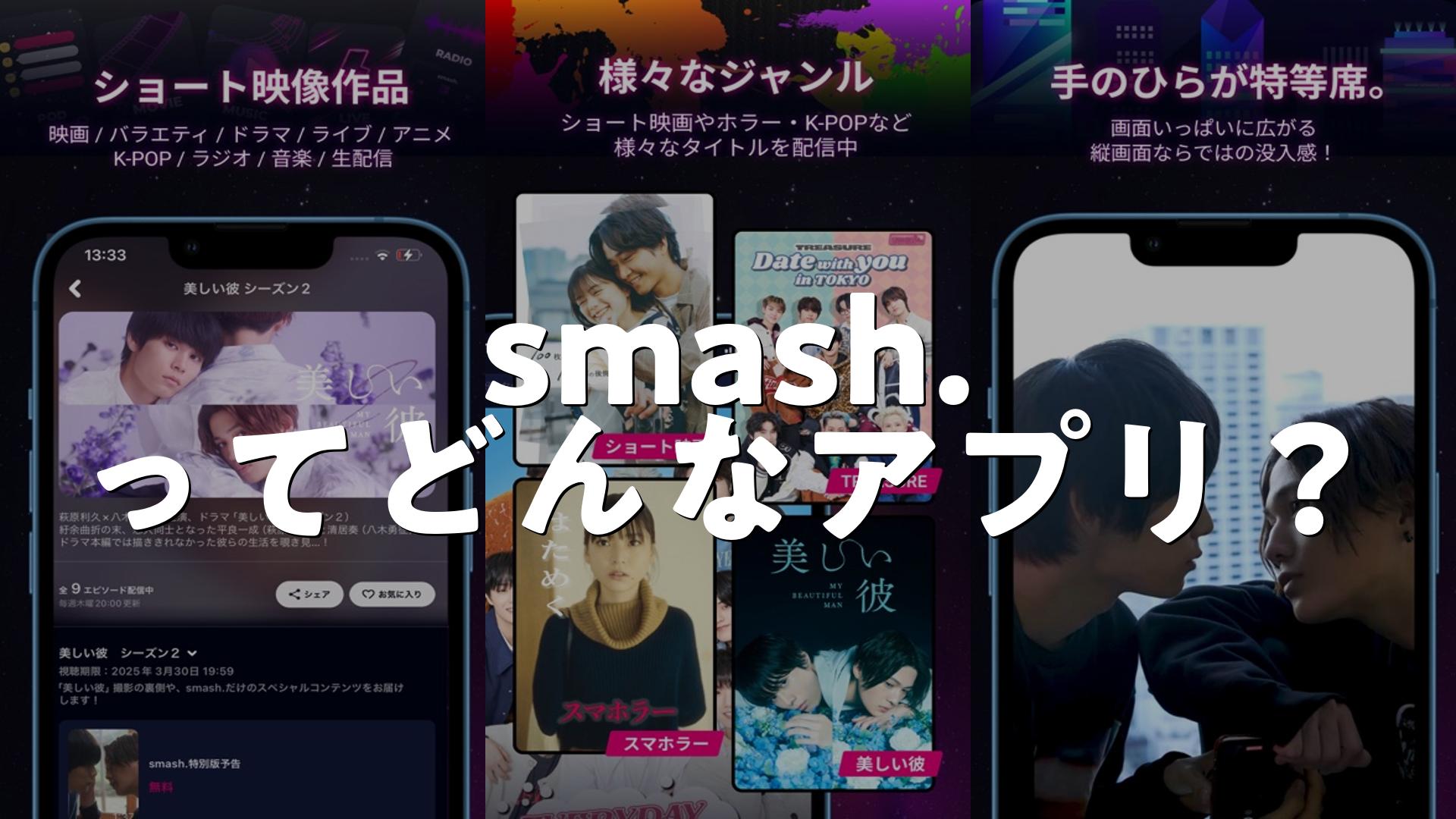 smash.(スマッシュ)は縦型ショート映像に特化した動画配信サービスで、映画、バラエティ、ドラマ、ライブ、アニメ、K-POP、ラジオ、音楽、生配信など多彩なジャンルを配信しています。縦画面に最適化された没入感ある映像、1エピソード5〜10分の短いコンテンツ、smash.でしか見られないオリジナル作品、そして好きなシーンを切り取って保存・共有できるPICK機能などが特徴です。お問い合わせは support@smash-media.jp まで(営業時間や休業日は公式案内を参照)。