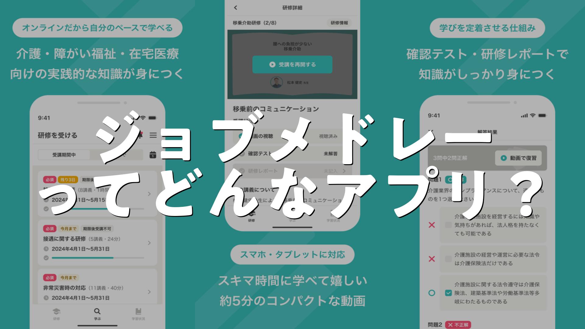 ジョブメドレーアカデミーは介護・障がい福祉・在宅医療向けのオンライン動画研修サービスです。本アプリではプロの講師による充実した研修動画をスマホやタブレットから、いつでも、どこでも視聴できます。提供コンテンツは介護基礎や実技、事故防止、認知症、障がい支援、管理者向け研修など多岐にわたります。なお、本アプリの利用には別途ジョブメドレーアカデミーとの契約が必要です。
