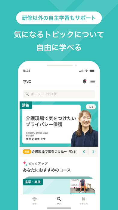 実際に触ってみると、現場で役立つテーマが揃っていて短時間で学べる点が魅力です。忙しい介護職の方にとって効率的に知識を補える良いツールだと感じました。(編集部)