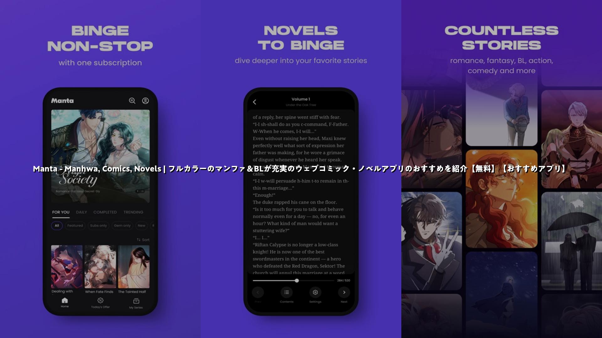 Mantaはフルカラー作品やBL・ロマンスが充実した読書アプリで、定額読み放題と個別課金を併用できるため、自分の読み方に合わせて使えるのが魅力です。まずは無料でダウンロードしてFree Passを試してみましょう。