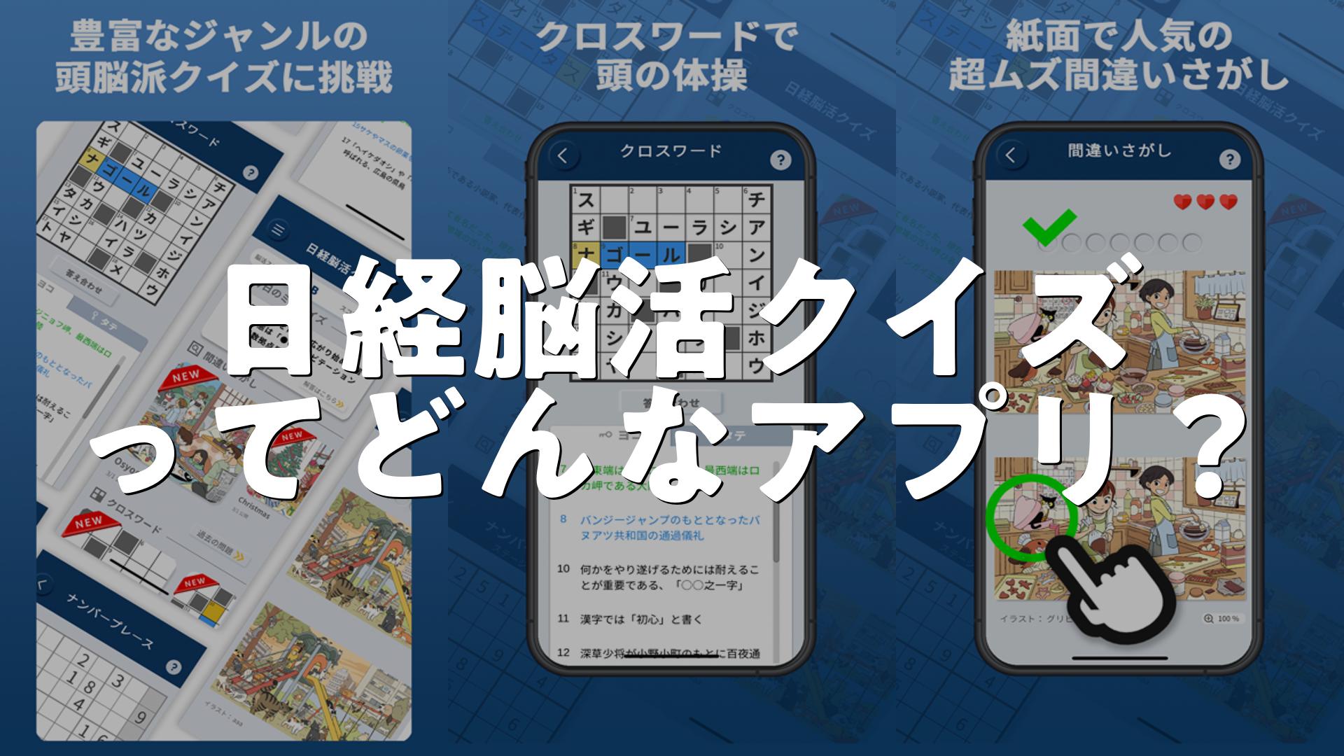 日本経済新聞で人気の「超ムズ間違いさがし」や「脳活チャレンジ」をベースにした頭脳派クイズアプリ。間違いさがし・クロスワード・ナンバープレースを中心に、クリアで「脳活スコア」が成長する仕組みや、1日1問のミニクイズなどを搭載。無料で遊べる範囲があり、月額会員になると全ての問題が解き放題になるフリーミアムモデルです。iPadにも対応しています。