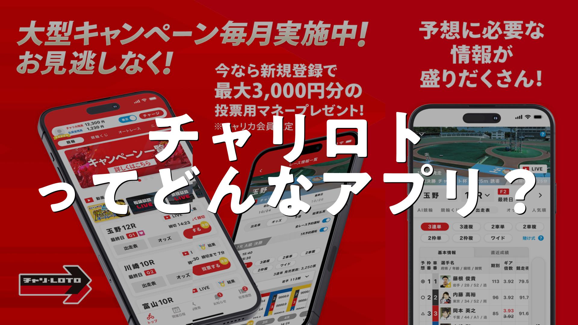 チャリロトは全国の競輪・オートレースの車券が購入できる公式アプリで、登録費・年会費は無料です。MIXIグループの株式会社チャリ・ロトが運営しており、キャンペーンやAI予想、充実した予想紙情報、複数の入金手段などを特徴としています。新規登録でのポイント付与や山分け・抽選キャンペーンなども行われており、競輪ファン向けの機能がまとまったアプリです。