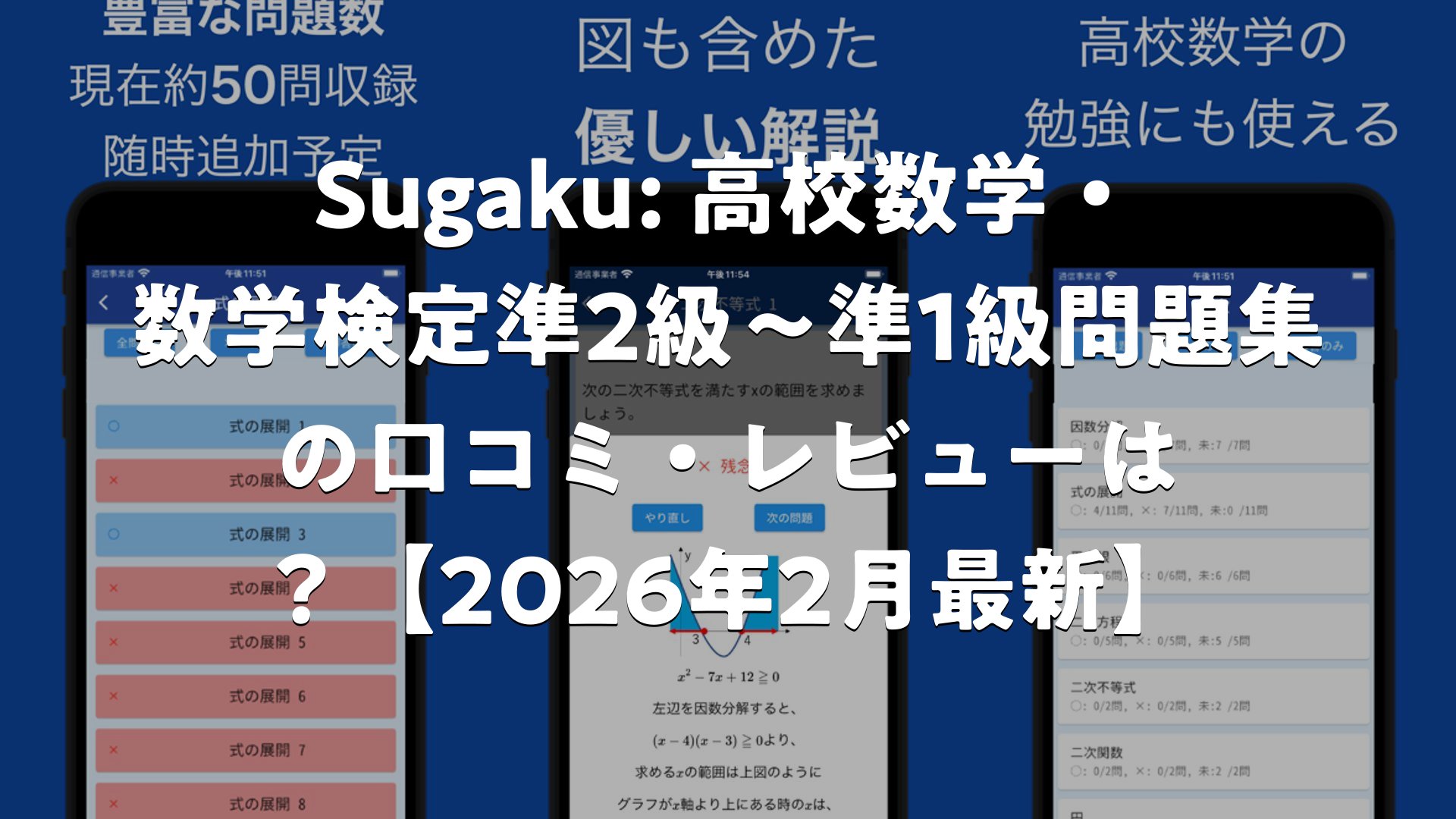 Sugaku:高校数学・数学検定準2級〜準1級(目安)問題集のユーザーレビューを見ると、高い評価が目立ちます。高校数学の復習や数学検定の対策に最適なアプリだと評されており、問題の質やアプリの使いやすさが特に好評のようです。