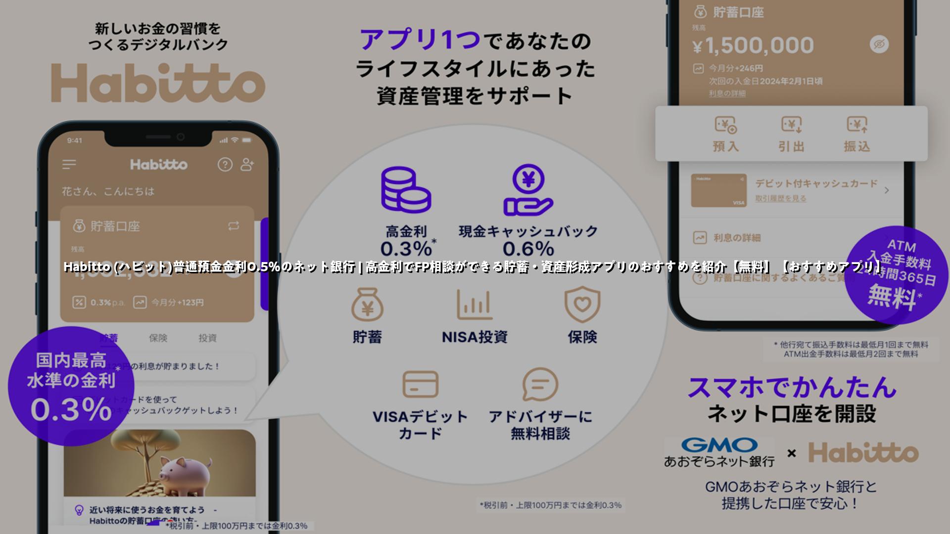 Habittoは普通預金で高めの金利(最大0.5%・100万円まで)を提供し、FP資格のアドバイザーにチャットやビデオで無料相談できるデジタルバンクアプリです。デビットのキャッシュバックや使いやすいUIで貯蓄習慣を作りたい初心者に特におすすめします。
