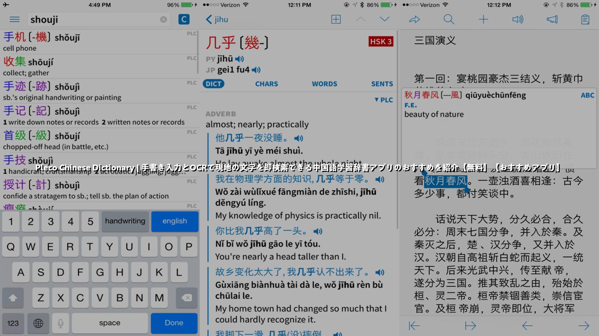 Plecoは無料で使える辞書機能を核に、手書き入力・OCR・リーダー・フラッシュカードといった学習機能を組み合わせて使える中国語学習アプリの決定版です。学習の幅を広げたい方に最適です。
