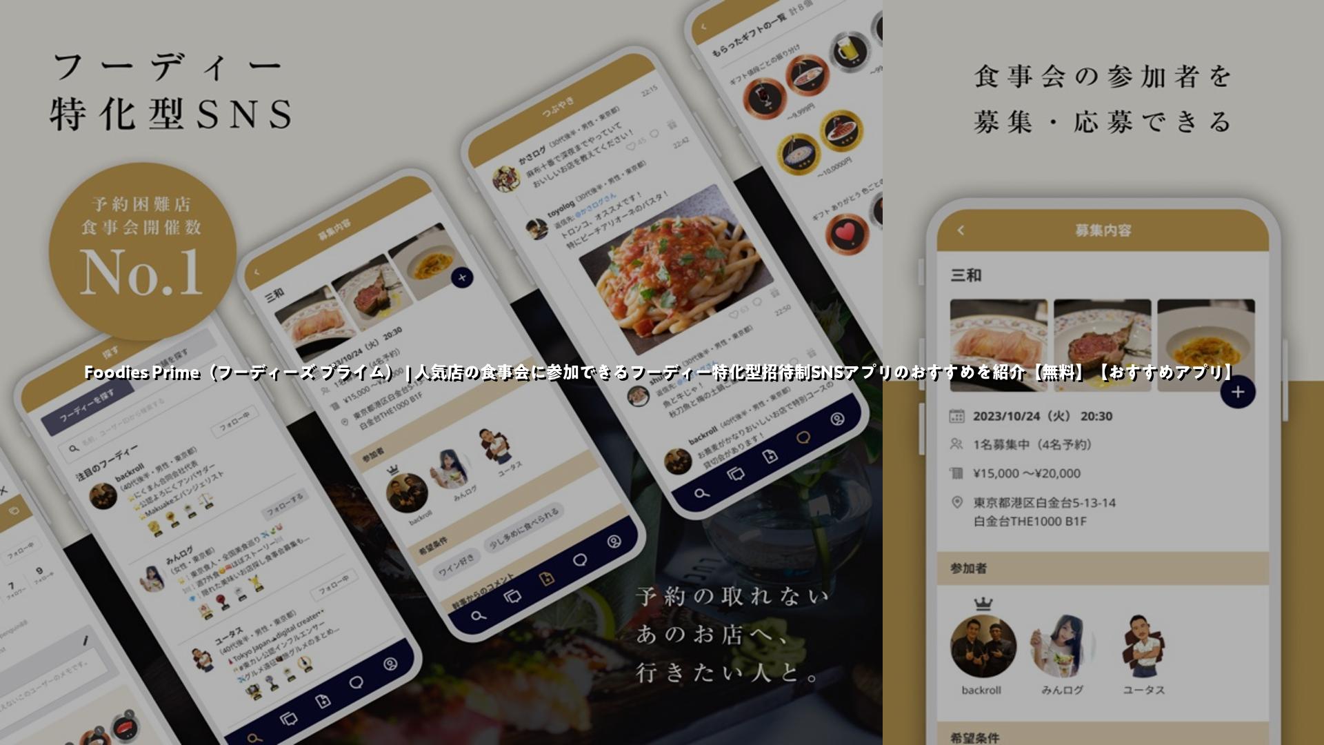 招待制のグルメSNS「Foodies Prime」をご紹介。人気店の食事会に同席者として応募したり、幹事として参加者を募集したりできるサービスです。プロフィールで相手を確認しながら安心して交流でき、上質な大人の出会いや予約困難店への参加に便利なアプリです。