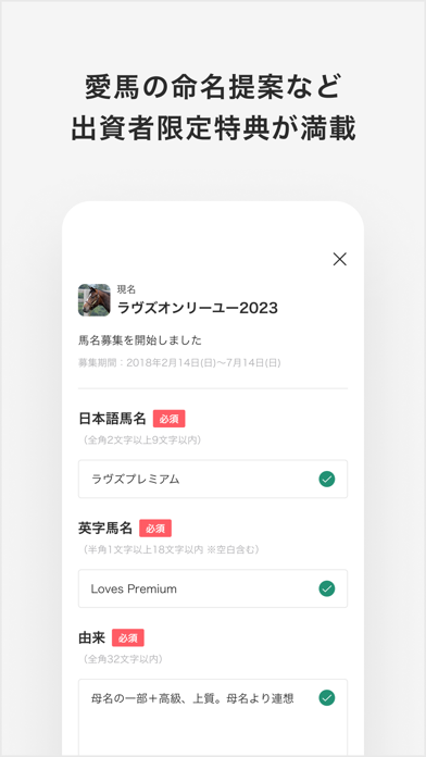 気軽な出資金設定や無料でのアカウント登録など、参入のしやすさもポイントです。競馬初心者やファン層の裾野を広げられる可能性のあるアプリだと言えるでしょう。