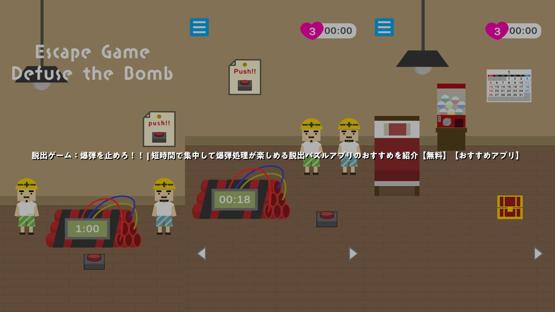 「爆弾を止めろ!!」は、なぜか爆弾のある部屋に閉じ込められたジョージとエドワードを操作して、制限時間内に爆弾を止めていく脱出風のパズルゲームです。難易度は中〜難で、謎解きやロジック、パズル要素が詰まっており、頭を使うゲームが好きな方に向いています。操作はタップやドラッグが中心でシンプル。自動保存やヒント機能が付いているので、途中でやめても続きから再開できます。時間制限があるためスピード感のあるプレイになりますが、短時間で集中して遊べるため通勤・通学中の暇つぶしにも適しています。最後まで無料で遊べる点も魅力です。