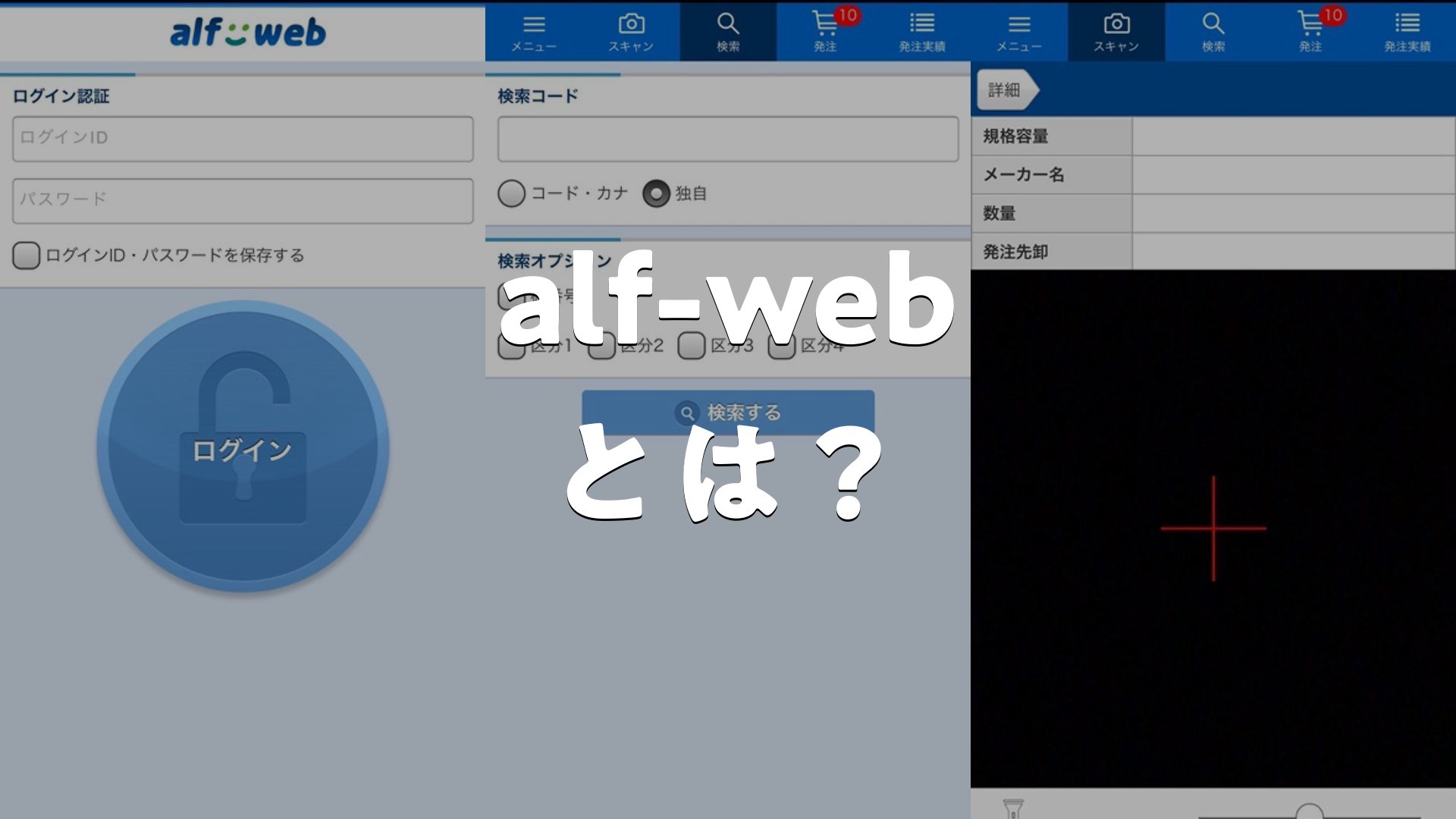 alf-web発注はアルフレッサグループ各社が提供する、パソコン向けWebサイト「alf-web」の発注機能と連携するiOS専用アプリです。バーコード読み取りで素早く商品を登録し、そのまま発注送信や発注履歴の確認が可能。医療機関の発注業務を手軽かつスムーズに行うことを目的としており、パソコンでの操作とシームレスに連動しながらも、外出先や現場での操作に最適化されています。