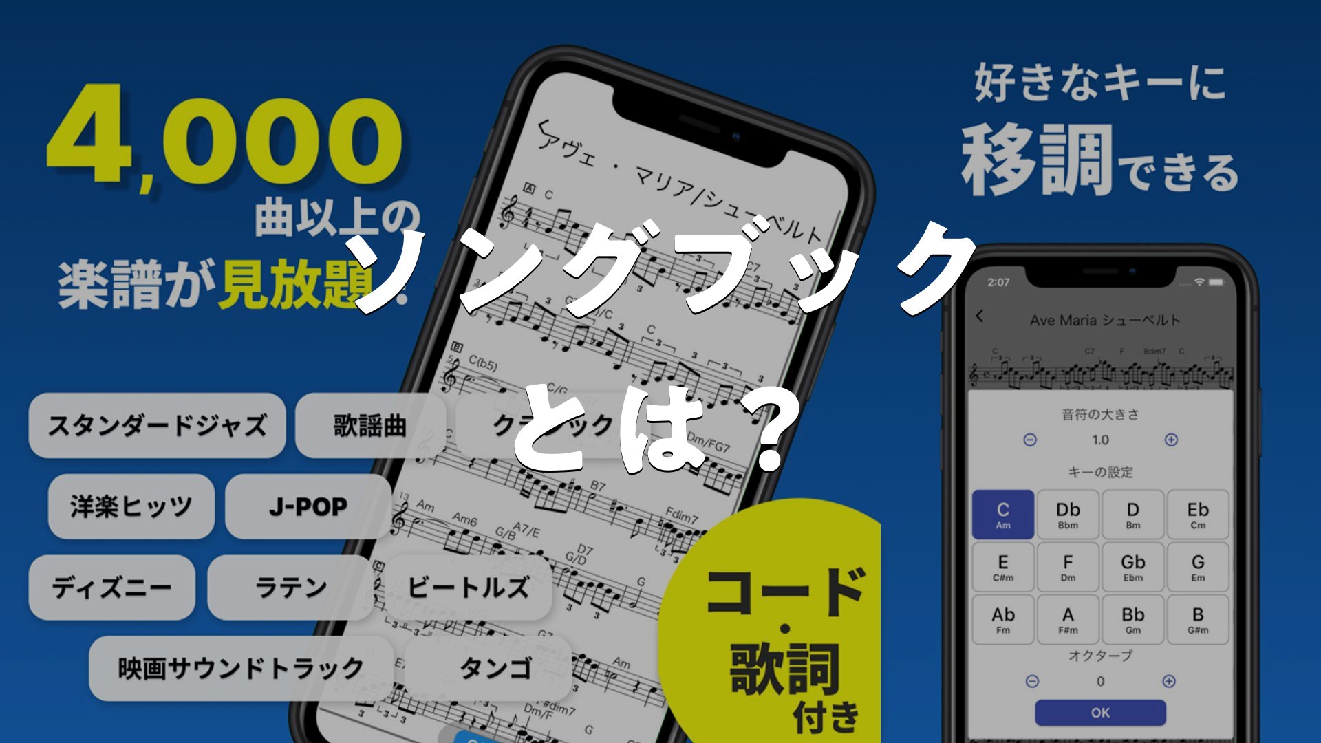 楽譜の管理やコード進行の確認がこれ一つで簡単にできる「ソングブック-コード進行付き楽譜・スコア・がくふ・譜面管理」は、音楽好きにとって強い味方です。多彩な楽曲が収録され、移調もワンタッチ!初心者からプロまで幅広く使える便利なアプリです。