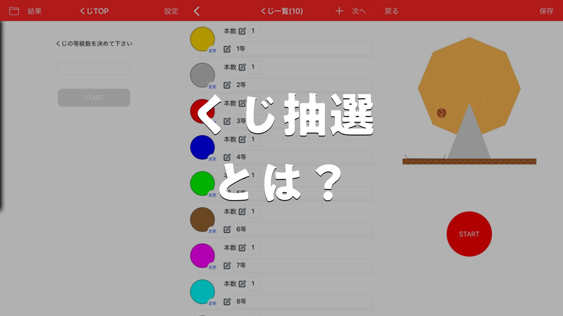 まずはアプリを起動し、新規にくじを作成します。等級数(当たりの種類やランク数)を決め、次にくじの本数を指定。その後、表示されるくじの内容を編集し、それぞれのくじの文言や色を自由に設定できます。編集完了後、保存すればすぐに抽選が行え、参加者に見せながら引くことも可能です。結果は保存・上書き保存ができ、後から何度でも確認・編集できます。操作はシンプルなので、初めての方でも迷わず直感的に使えます。