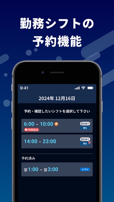 • 勤務シフト予約機能:ドライバー自身が勤務可能な日時をアプリで予約可能。シフト枠内なら時間選択も自由なので、スケジュール調整が容易です。