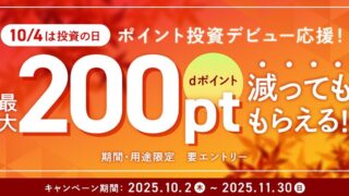 最新ニュース ポイント投資:「ポイント投資開始でポイントが減っても最大200ptもらえるキャンペーン」を開催! ニュースの要約 株式会社NTTドコモが「ポイント投資開始でポイントが減っても最大200ptもらえるキャンペーン」を開催 10月4日の「証券投資の日」に合わせたキャンペーン 「ポイント投資」サービスを初めて利用するお客様を対象に、最大2... 2025.10.03 最新ニュース