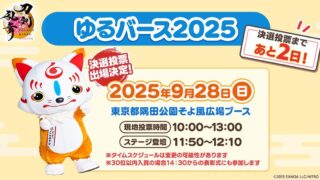 最新ニュース 刀剣乱舞ONLINE:「おっきい こんのすけ」が「ゆるバース2025」の決選投票に出場決定 ニュースの要約『刀剣乱舞ONLINE』の宣伝隊長「おっきい こんのすけ」が、9月28日(日)に開催される「ゆるバース2025」の決選投票に出場することが決定しました。決選投票会場では、「おっきい こんのすけ」に投票した方に、限定の缶バッジが... 2025.09.27 最新ニュース