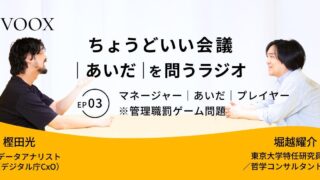 最新ニュース VOOX/Spotify:ちょうどいい会議|あいだ|を問うラジオ『Ep.3 マネージャー|あいだ|プレイヤー ※管理職罰ゲーム問題』音声教養メディアVOOX/Spotifyにて、配信開始! ニュースの要約東京大学の堀越耀介氏と、デジタル庁のデータ分析担当の樫田光氏が出演する「ちょうどいい会議|あいだ|を問うラジオ」第3話が、音声教養メディアVOOX/Spotifyにて配信開始本編では、「マネージャーとプレイヤー」の「あいだ」や... 2025.10.08 最新ニュース