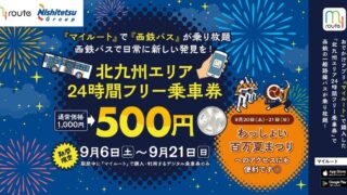 最新ニュース my route:「北九州エリア24時間フリー乗車券」期間限定500円キャンペーンを実施します! ニュースの要約 my routeが、2025年9月6日から21日まで「北九州エリア24時間フリー乗車券」を期間限定500円で販売するキャンペーンを実施 北九州市内の西鉄路線バスが24時間乗り放題となるデジタル乗車券で、紙の乗車券購入時よ... 2025.09.07 最新ニュース