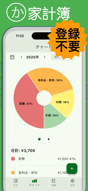 「家計簿Kakeibo 月間年間グラフ分析 広告なし登録不要」は、日々の収入と支出を手軽に記録し、月別・年別のグラフでお金の流れを視覚的に把握できる家計簿アプリです。最大の特徴は、すべての機能が無料で使えて、広告が一切表示されず、会員登録も不要という点。インストールしたその瞬間から、ストレスなく家計管理を始められます。さらに、一般的な家計簿アプリにはない在庫管理機能も搭載しており、食品や日用品のストック管理まで一元化できるのが魅力です。カテゴリのカスタマイズやレシート撮影による簡単入力にも対応しているため、毎日の記録が苦になりません。
