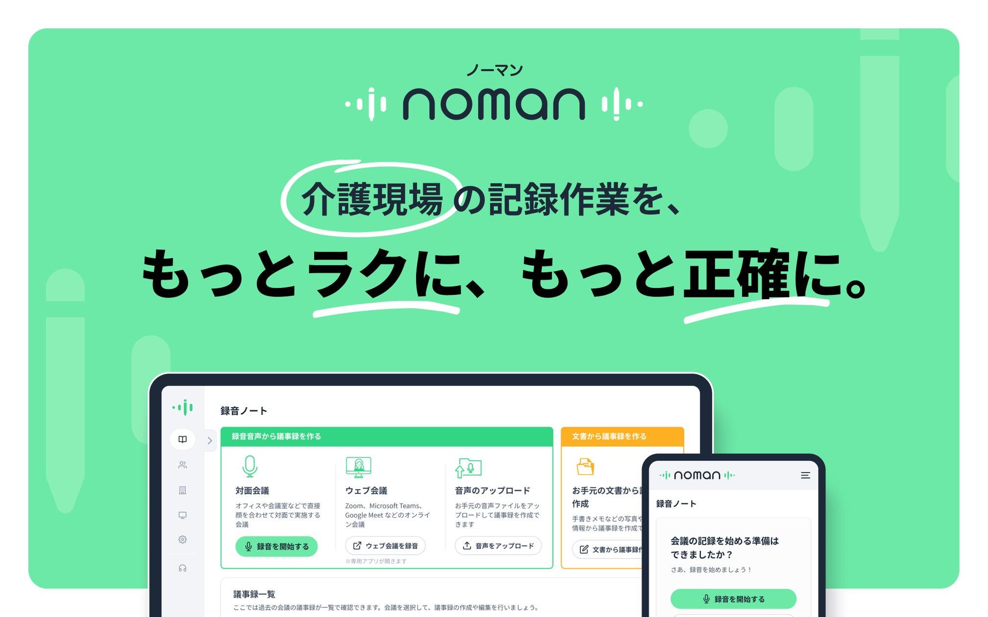 「noman」は最先端の生成AIを活用し、介護現場で行われるカンファレンスや委員会等の議事録・記録作成に加えて、計画書作成業務を自動化することで、業務効率を大幅に向上させるアプリケーションです。導入事業所数は10,000件を突破し、介護業界における必須ツールとしての地位を確立しています。
