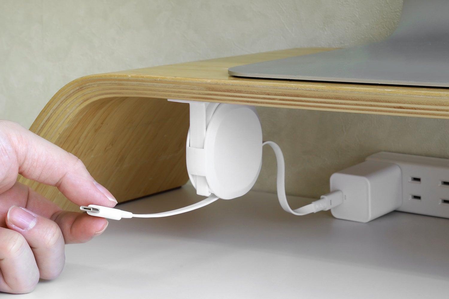 本製品は、必要な長さだけを引き出して使えるkatamaki構造と、デスクに固定できるスタンドを組み合わせることで、日常の充電環境をすっきりと整えることを目指したモデルです。片方のケーブルだけが伸縮するから、リール部分が邪魔にならず、デスク周りや外出先など多くのシーンで活躍します。また、手のひらに収まるサイズにケーブルを収納できるので持ち運びにも最適です。