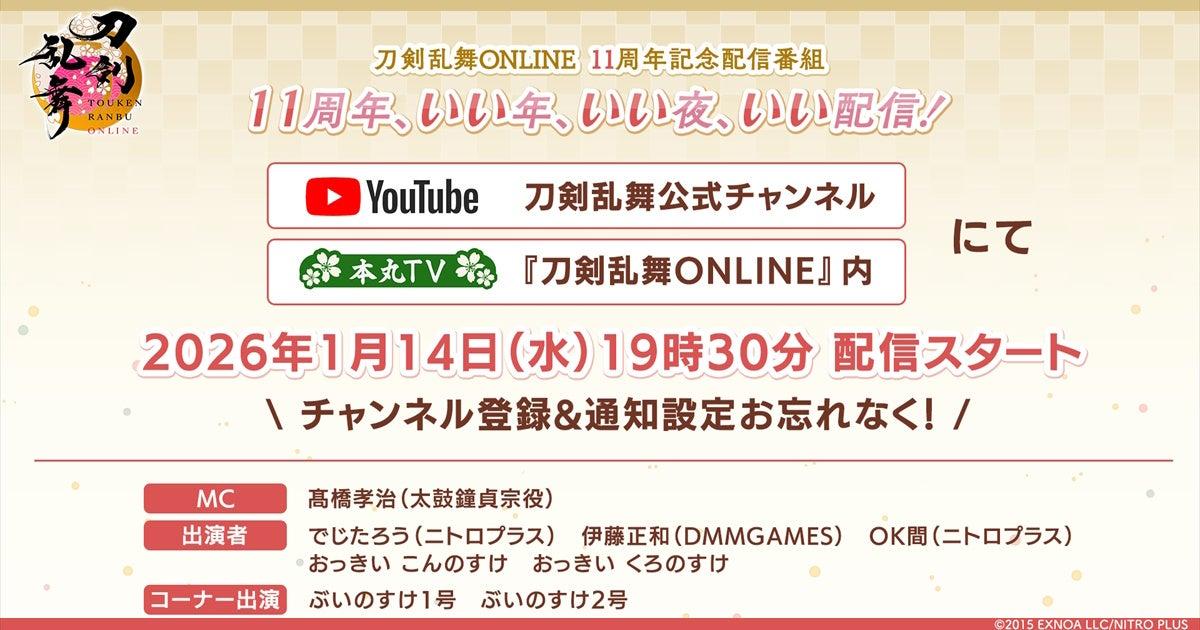 合同会社EXNOAは、『刀剣乱舞ONLINE』のサービス開始11周年を記念し、2026年1月14日(木)19:30より「刀剣乱舞ONLINE 11周年記念配信番組11周年、いい年、いい夜、いい配信!!」を配信することを発表しました。