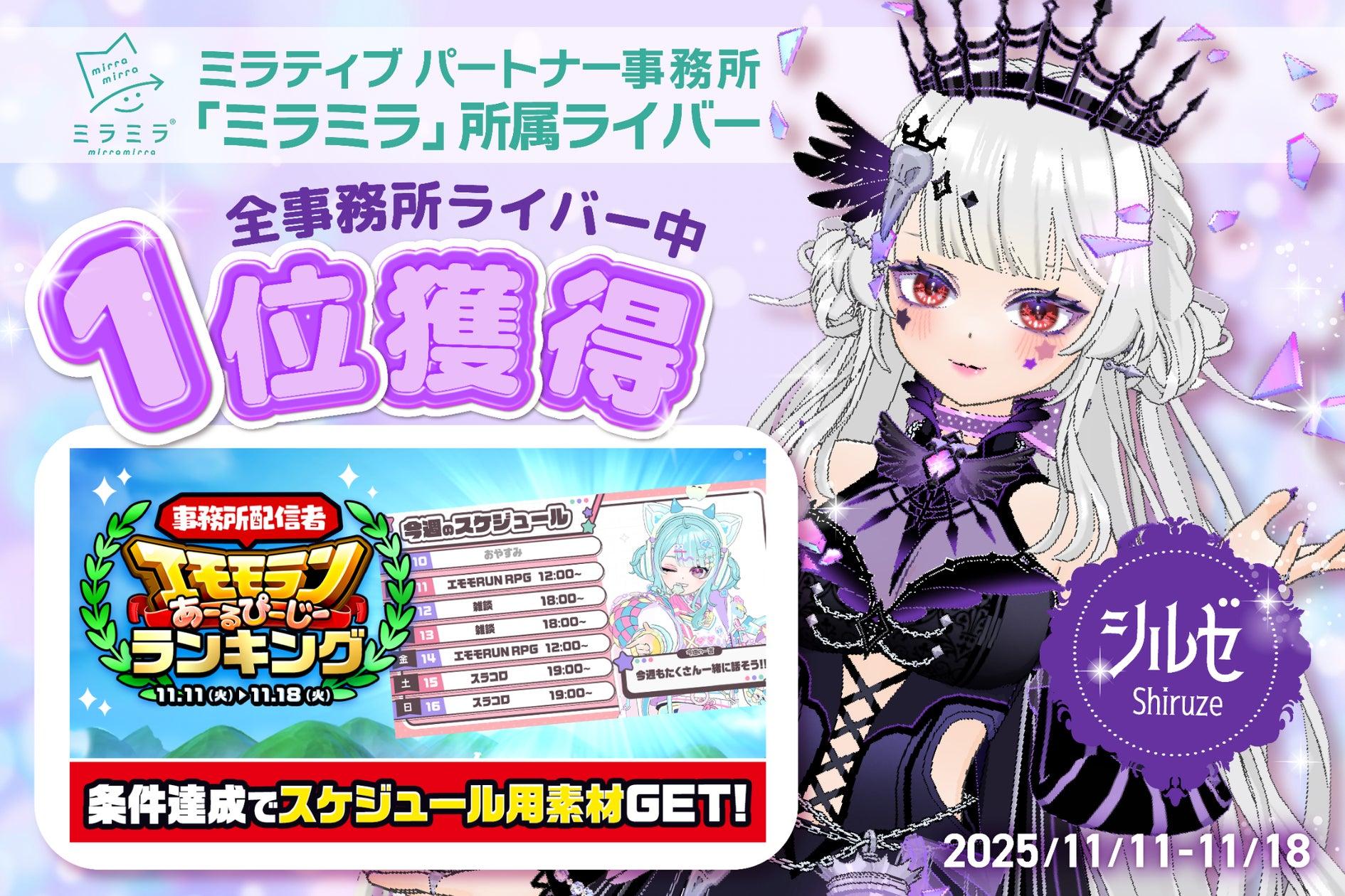 OTAGROUP株式会社は、スマホ画面共有型ゲーム配信プラットフォーム「Mirrativ」のパートナー事務所「ミラミラ」に所属するライバー「シルゼ」が、2025年11月11日から11月18日に開催された「事務所配信者エモモランあーるぴーじーランキング」で、参加した事務所に所属するライバーの中で1位を獲得したことを発表しました。