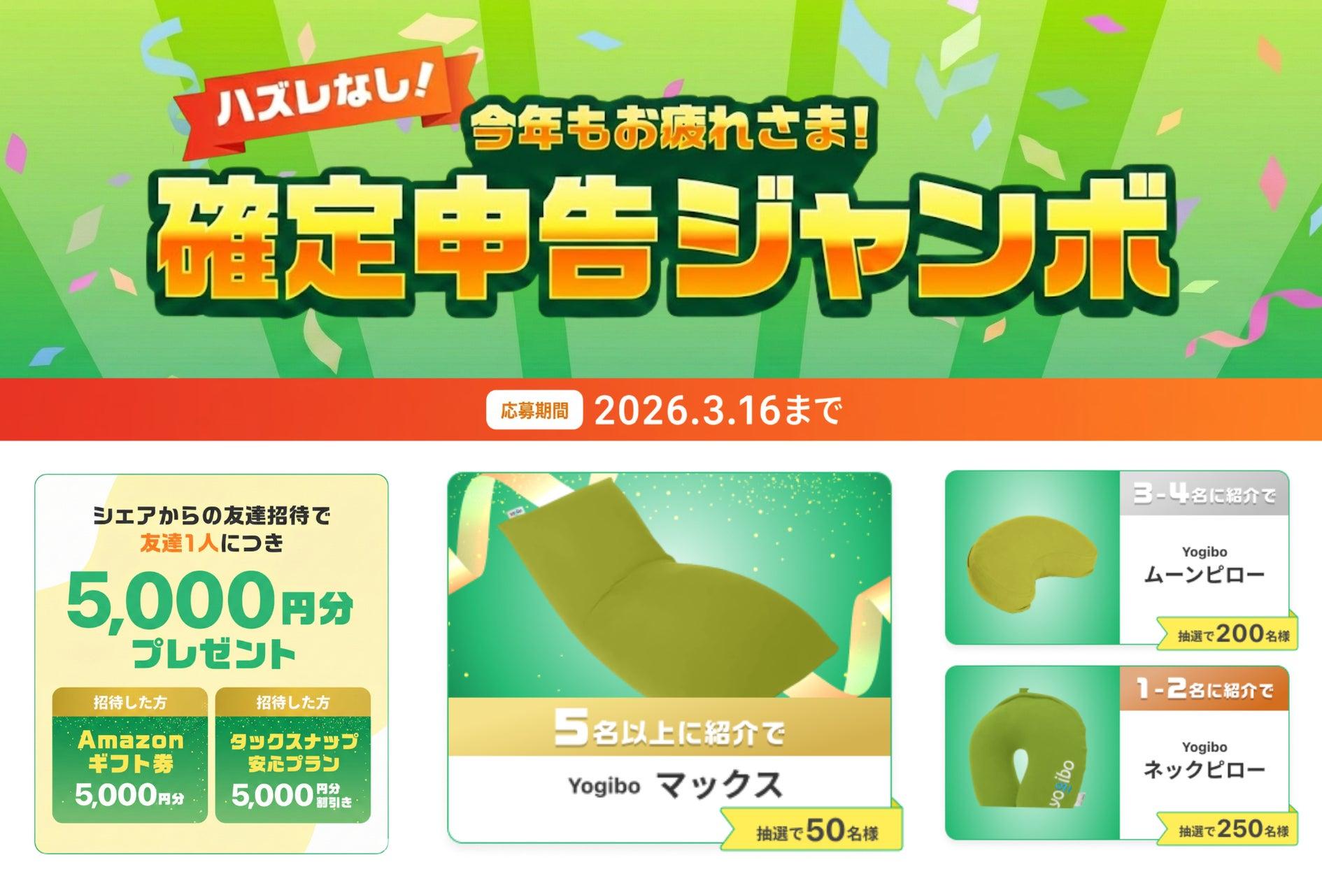 株式会社タックスナップは、2026年1月19日(月)より、確定申告アプリ「タックスナップ」にて「確定申告ジャンボ」キャンペーンを実施します。