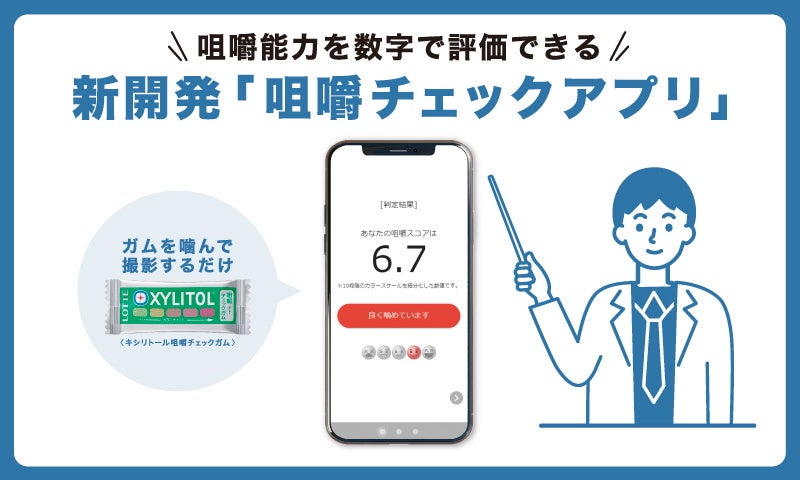 「キシリトール咀嚼チェックガム」は2004年発売で、噛むと色が変わることで咀嚼能力を見える化しました。さらに2023年2月にはスマホと連動する「咀嚼チェックアプリ」が公開され、より正確で客観的な評価が可能となりました。