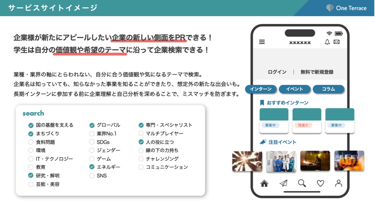 株式会社One Terraceは、日本政策金融公庫五反田支店からの特別貸付により資金調達を実施しました。この資金を活用して、学生と企業を繋ぐオンライン送客サービス「My Intern」への投資を強化。企業が大切にする価値観を軸にした採用母集団形成を目指し、採用ミスマッチの軽減や全国・海外の学生への情報格差解消に取り組みます。
