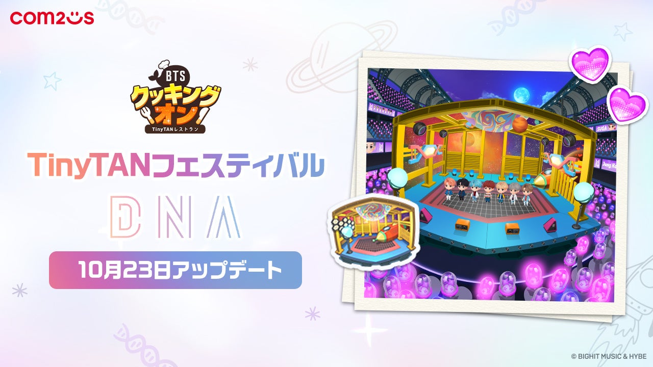 株式会社Com2uS Japanが提供するスマホ向け料理ゲーム『BTSクッキングオン:TinyTANレストラン』に2024年最新アップデートとして、新しい「TinyTANフェスティバル」シリーズのひとつ、「DNA」テーマが追加されました。BTSのヒット曲「DNA」をモチーフにしたこのフェスティバルでは、プレイヤーがベーカリーコンセプトのレストランを舞台に、クリームチーズベーグル、プレッツェル、生クリームパン、ロールケーキといった多彩なスイーツ作りに挑戦できる仕組みとなっています。