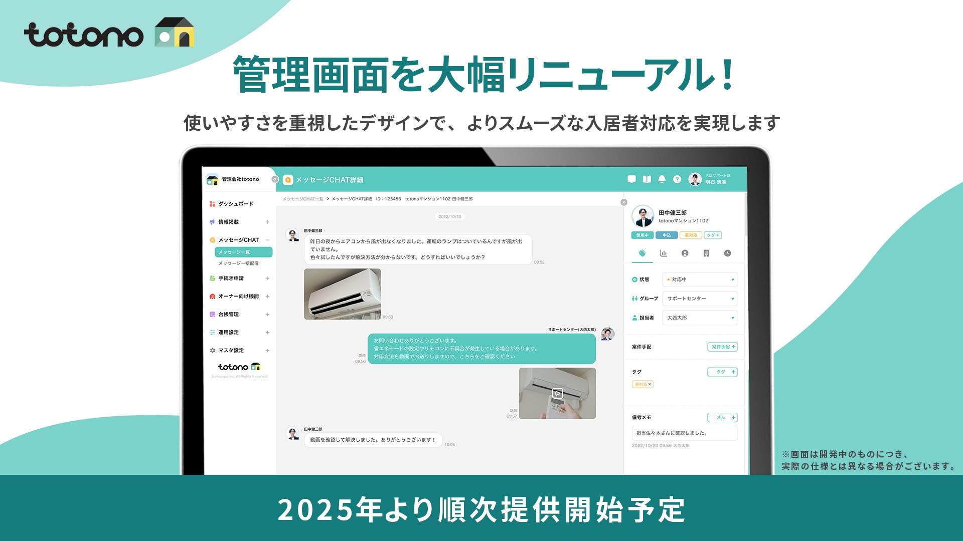 株式会社スマサポは、入居者アプリ「totono」の管理画面を全面的に刷新。2025年から新デザインと機能の提供を始めます。今回のアップデートでは、サムネイル付きお知らせ掲示板や強化された検索機能、チャット機能の追加、利用状況の見やすいダッシュボードなどの改善を行い、入居者と管理会社の双方にとっての利便性を追求しています。