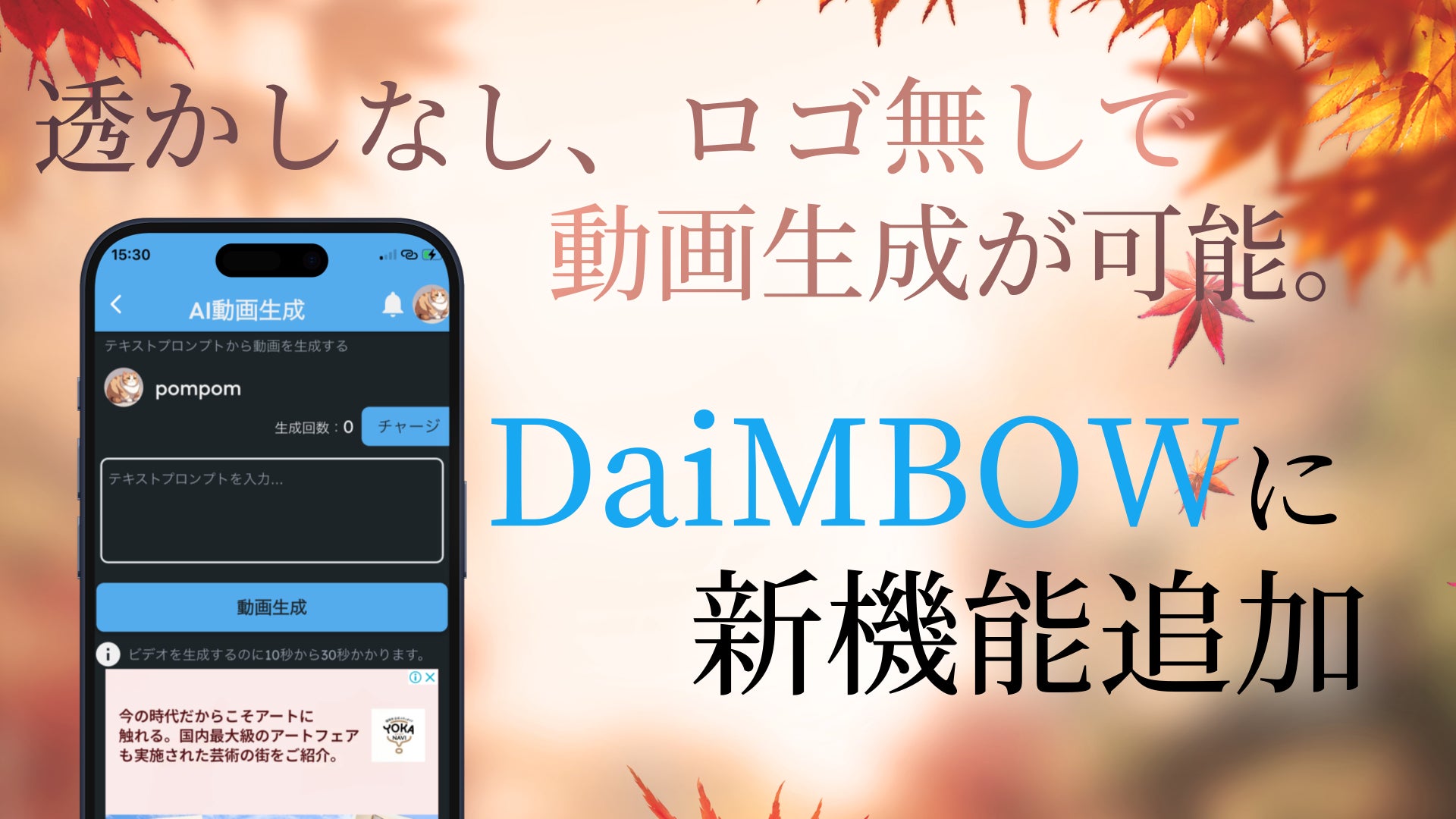 近年、AI技術を利用した動画生成サービスが増加していますが、多くのサービスでは透かしやロゴが強制的に入ることが一般的でした。そこでMYOHO Group合同会社は、AI動画専用共有アプリ「DaiMBOW」に画期的な機能を加え、ユーザーが透かし・ロゴなしのAI動画を生成できるようにしました。