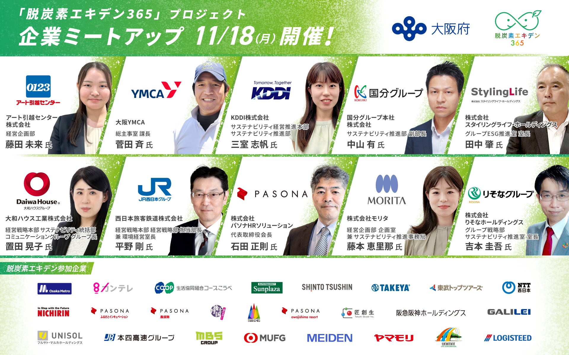 大阪府と株式会社スタジオスポビーが連携し進める「脱炭素エキデン365」プロジェクト。その大きな節目として、参加企業が一堂に会するミートアップイベントが2024年11月18日に開催されます。テーマは「『ひと』による脱炭素とSDGsの達成」。脱炭素社会の実現にむけた取り組みが、企業だけでなく個人にも広がっています。