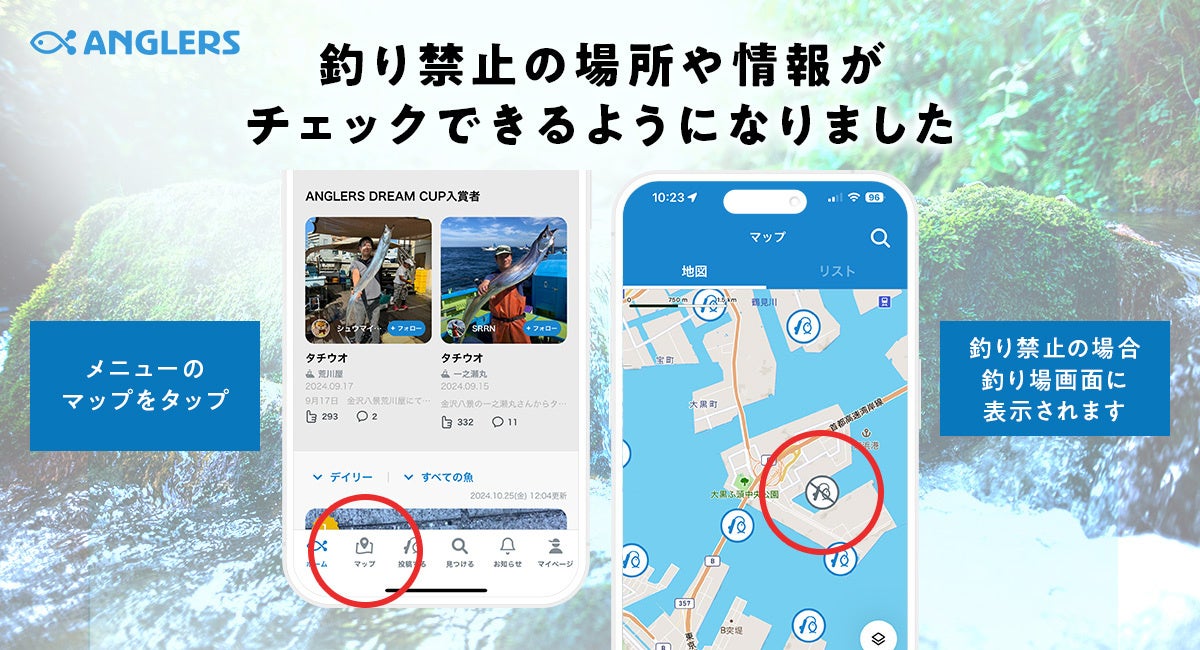 国内最大級の釣り専用SNS「ANGLERS」は、5,000か所以上の釣り場データと600万件以上の釣果情報を誇る人気アプリ。今回実装された新マップ機能は、自治体や釣り場管理者から提供された信頼性の高い釣り禁止情報を集約し、ユーザーに提供するものです。