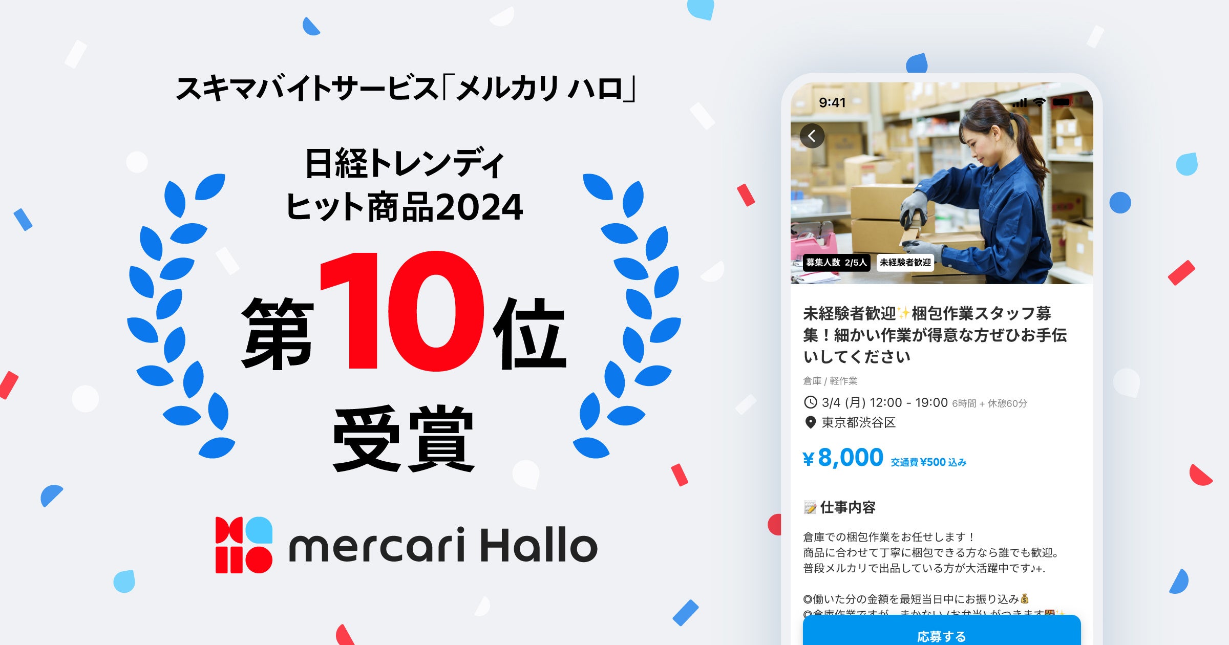 2024年11月1日発売の『日経トレンディ』2024年12月号において、メルカリのスキマバイトサービス「メルカリ ハロ」が「2024年ヒット商品ベスト30」の第10位にランクインしました。活況を呈するスポットワーク市場で、登録者800万人突破やパートナー店舗12万店超えが高評価の要因です。