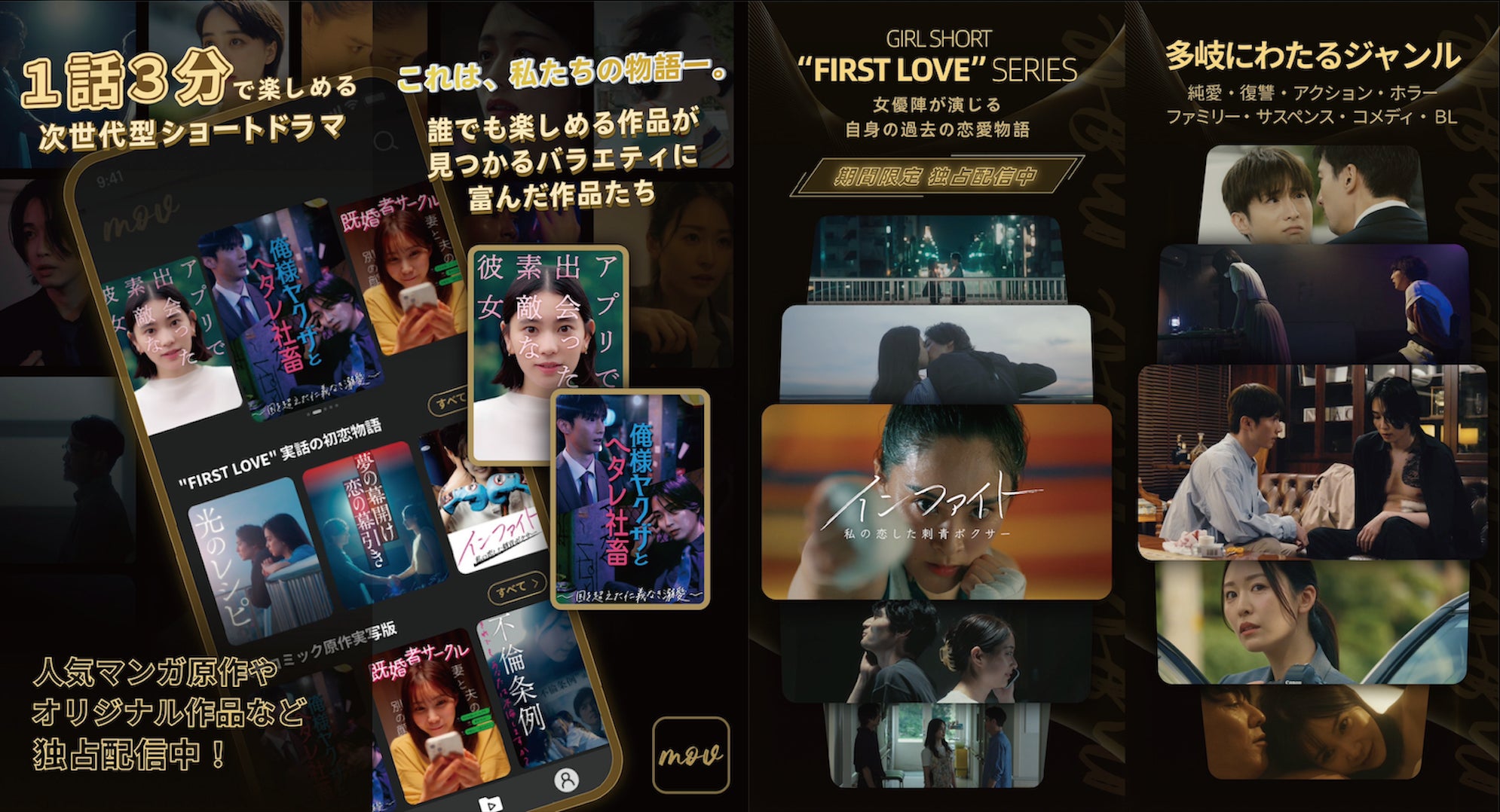 mov株式会社が提供するショートドラマ&映画アプリ「mov」が正式サービスを開始。全オリジナル作品の配信が始まり、作品の第1話はYouTubeで無料公開中。日本のコンテンツを世界へ届けることを目指し、多言語対応・AIによる字幕翻訳を搭載。基本1話3分の短編ドラマが10話~20話で構成されており、無料視聴も可能。今後さらなるタイトルも配信予定。