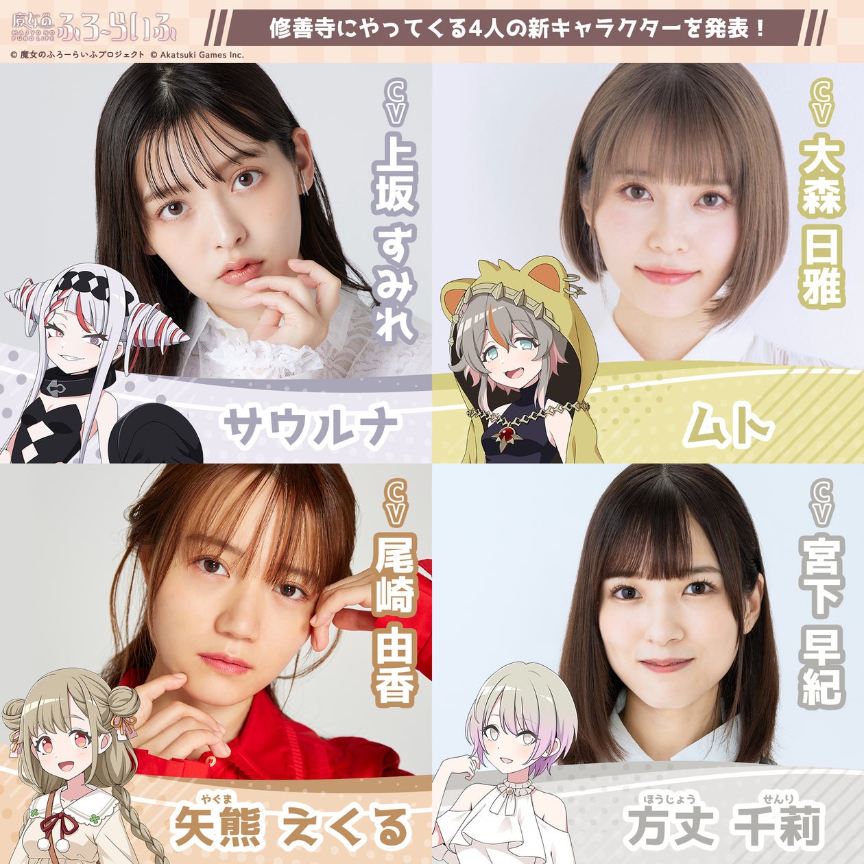 【株式会社アカツキゲームス】 アカツキゲームスのIP創出プロジェクト『魔女のふろーらいふ』、人気声優「上坂 すみれ」、「大森 日雅」、「尾崎 由香」、「宮下 早紀」らが演じる4人の新キャラを発表! by PR TIMESをまとめました