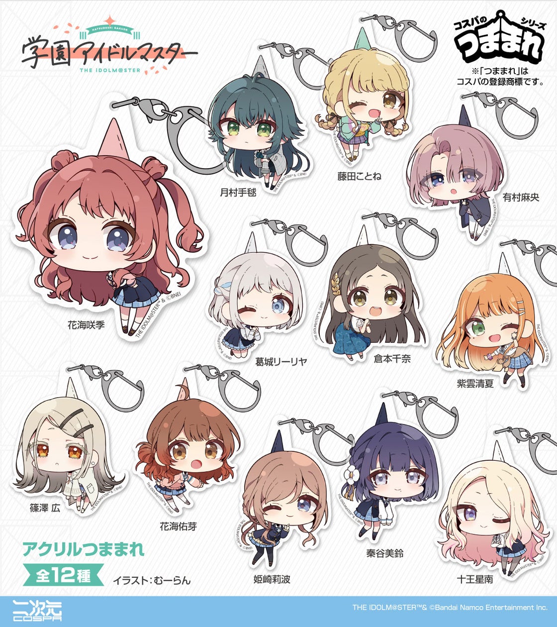 『学園アイドルマスター』のキャラクターグッズ「アクリルつままれ」に、初星学園所属の12人のアイドルが加わります。2024年11月下旬にはコスパの実店舗で先行販売され、一般販売は2025年1月下旬から二次元コスパ通販サイトで展開予定。デフォルメされた可愛いデザインとユニークな“つままれ”リアクションが特徴です。
