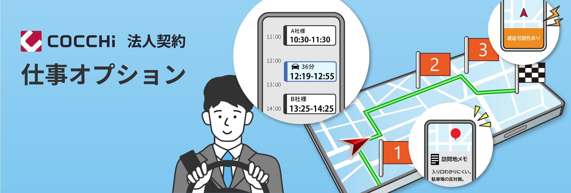 「COCCHi」の法人契約に追加される「仕事オプション」は、複数の訪問先を持つ配送や営業業務に特化した機能を備えています。訪問先と滞在時間を入力するだけで移動を考慮したスケジュールを自動作成し、空き時間の検索や出発アラーム、遅延通知、訪問地メモなど、訪問業務をトータルで強力にサポート。またオプションの「ゼンリン住宅地図オプション」との併用も可能で、細かな地理情報をナビ画面に表示し、個人宅配送やメンテナンス業務の効率化が期待されています。