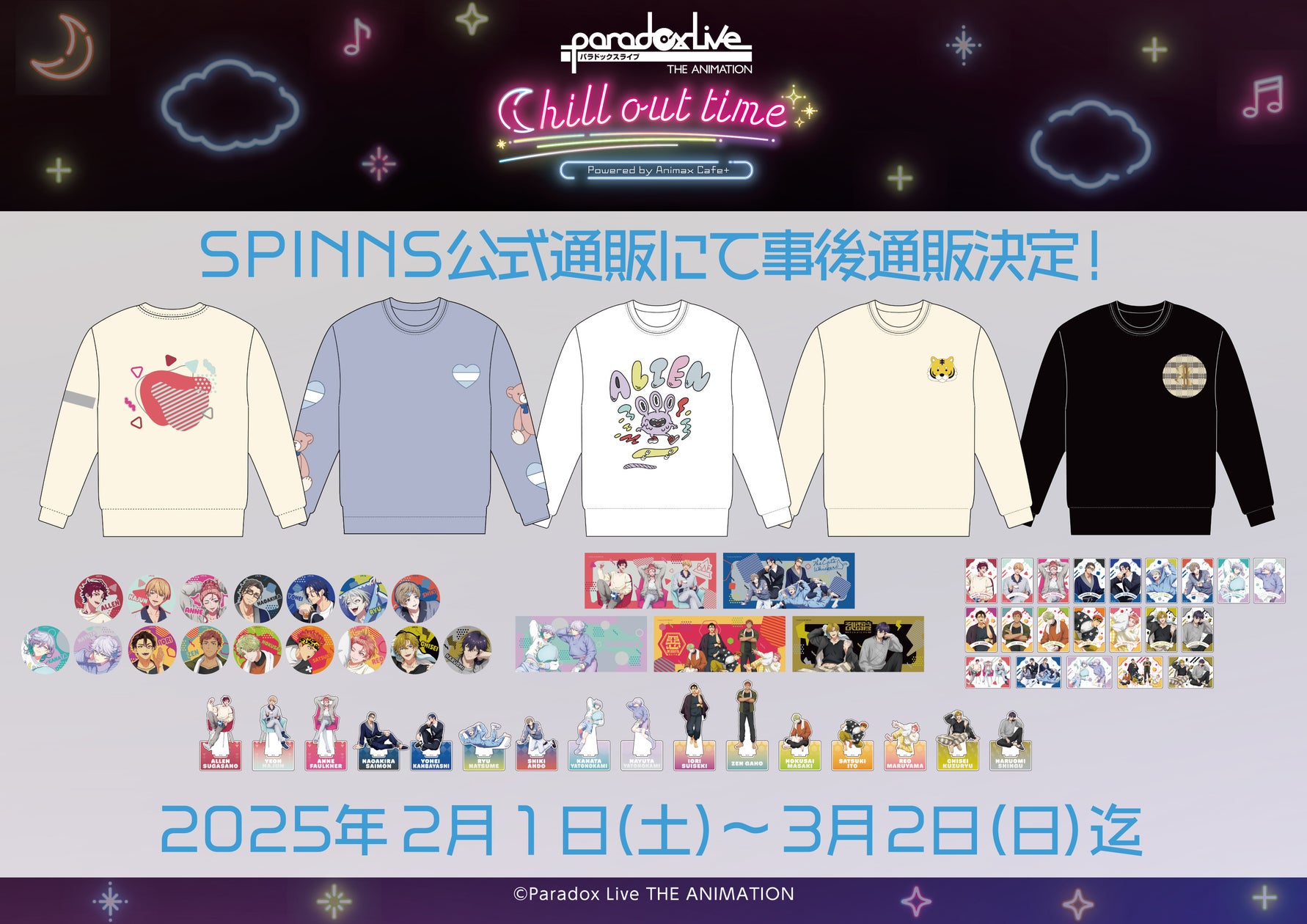 注目の『Paradox Live THE ANIMATION(パラアニ)』は、エイベックスとジークレストによるHIPHOPメディアミックスプロジェクト「Paradox Live」を原作としたTVアニメ。現在、各種配信サイトで配信中の話題作です。この度、劇中の世界観を体感できるコラボレーションカフェ限定グッズが、ファッションを中心にユースカルチャーを発信するSPINNS公式通販にて受注販売されることになりました。
