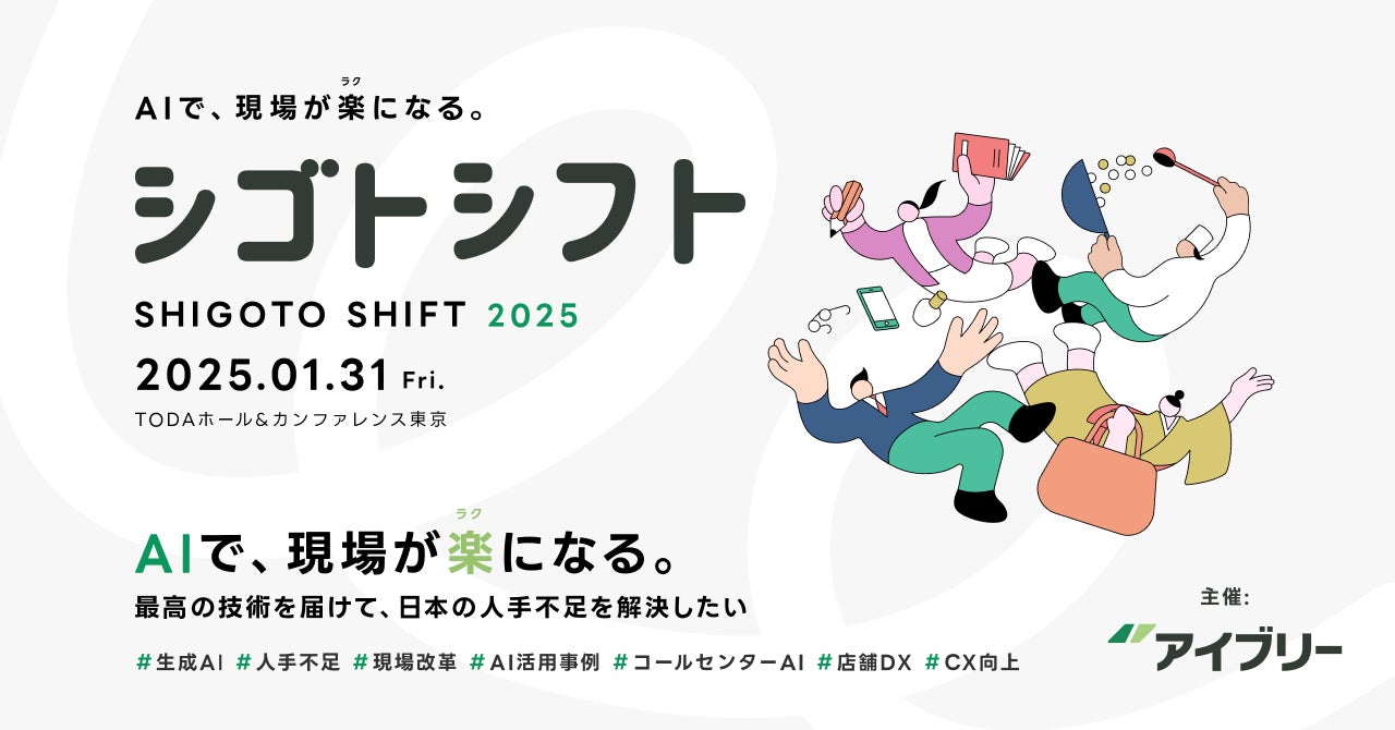 好評につき増席決定!対話型音声AI「IVRy」を提供する株式会社IVRyが主催するカンファレンス「シゴトシフト2025 – AIで、現場が楽(ラク)になる。」が、2025年1月31日に東京で開催されます。昨今の人材不足に対応するため、AI活用の最新事例を学べる貴重な機会として注目を集め、当初200席の予定が250席に増席されました。