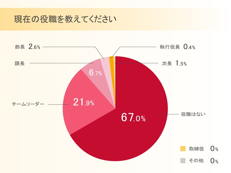 - 67%が役職なし、チームリーダーが21.9%、課長以上は11.2%