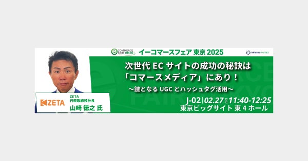 ZETA株式会社は、EC商品検索やレビュー、ハッシュタグ活用などのCX(顧客体験)ソリューションを展開する企業。今回の『イーコマースフェア 東京 2025』では、Z世代を中心に拡大するUGC(ユーザー生成コンテンツ)とSNS連携をテーマにしたセミナーを実施。2月27日(木)・28日(金)にはブース展示も行い、自社の最新サービス「ZETA CXシリーズ」の導入効果や活用方法を紹介します。