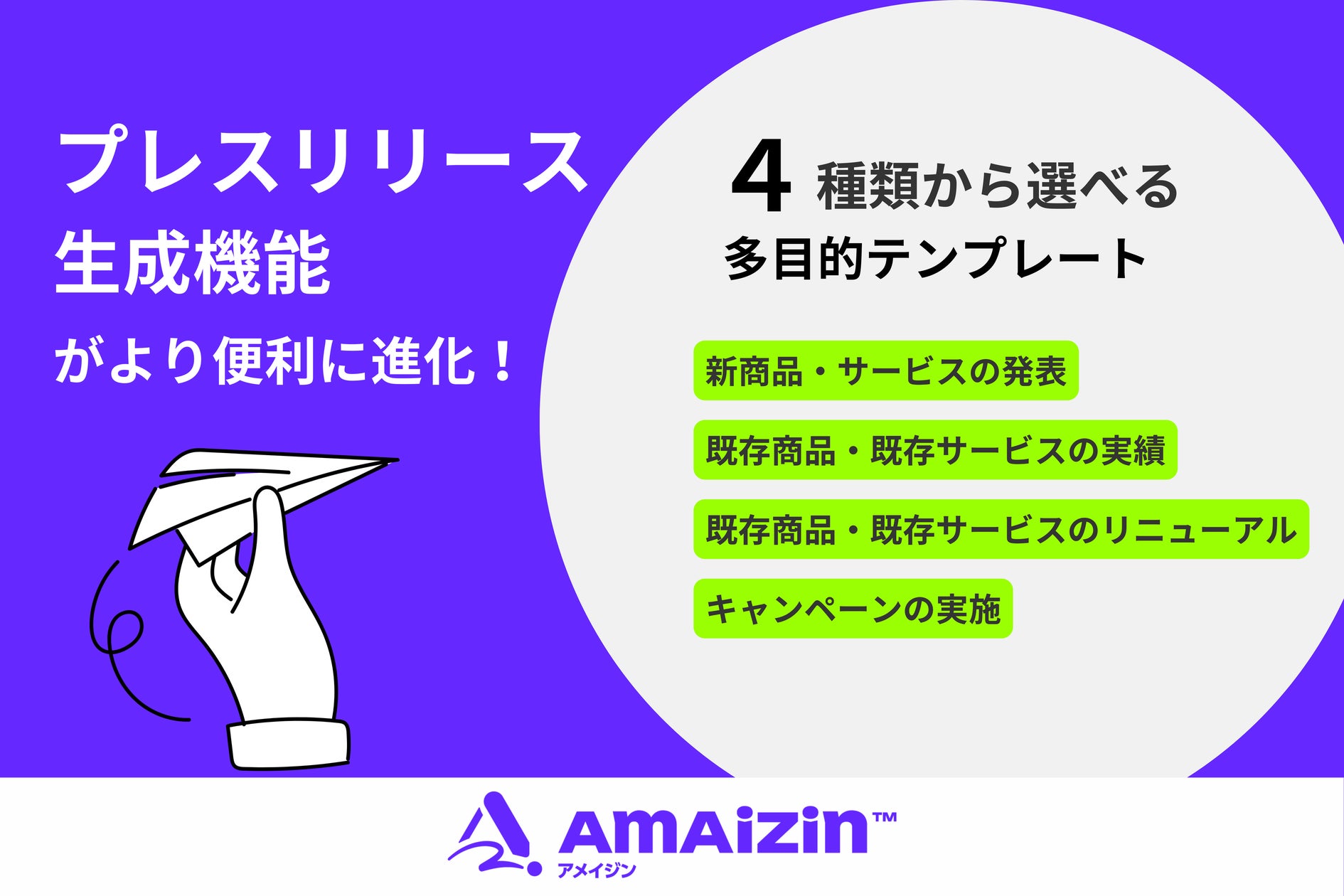 AIによるコンテンツ生成サービス「AMAIZIN(アメイジン)」のプレスリリース作成機能が大幅に進化し、発表以外にも実績報告やリニューアル、キャンペーン告知といった多様なシーンに対応可能となりました。これにより、企業は情報発信の効率化と増加を実現しやすくなります。AIの力でプレスリリース制作の負担を軽減したい方は注目のサービスです。
