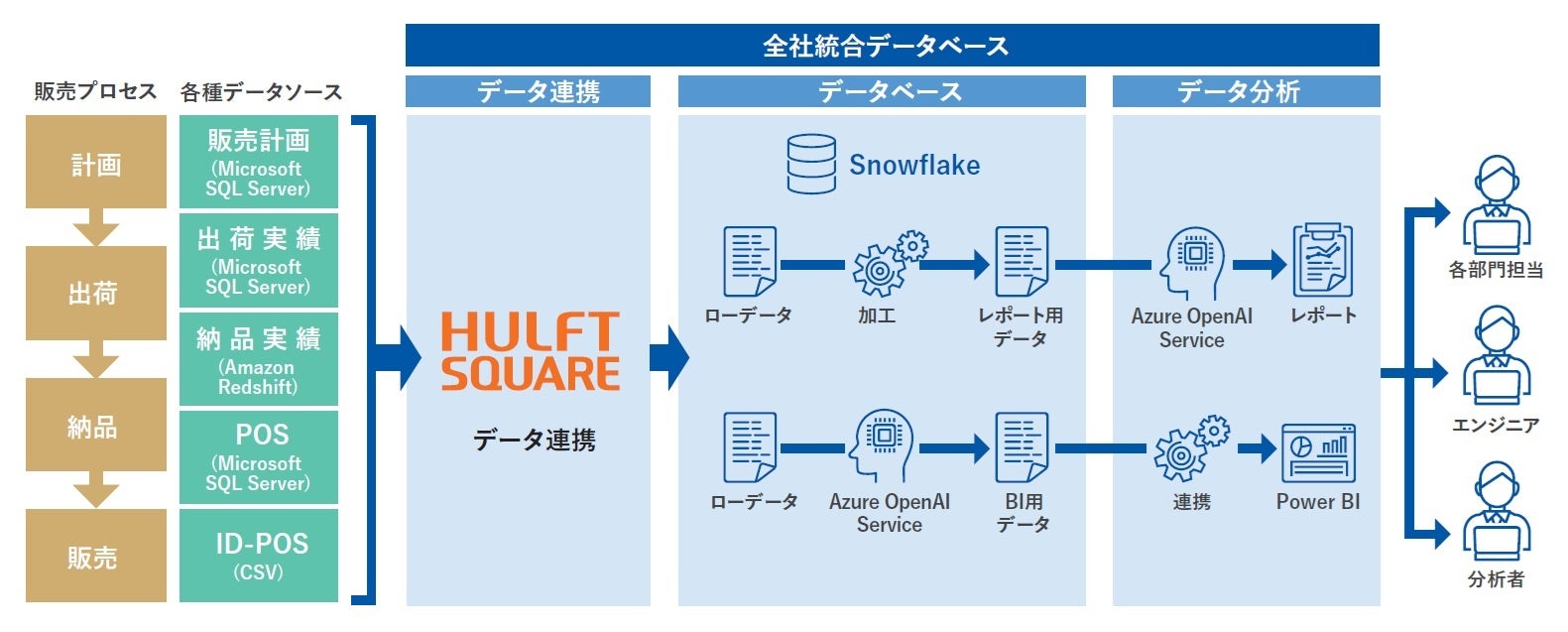 構築した全社統合データベースは「Snowflake」を基盤とし、生成AI技術と連動して、分析レポートの自動生成やBIツールと連携した自然言語でのデータ解釈が可能となりました。これにより、分析にかかる手間が大幅に削減されるだけでなく部門間のコラボレーションも活性化しています。