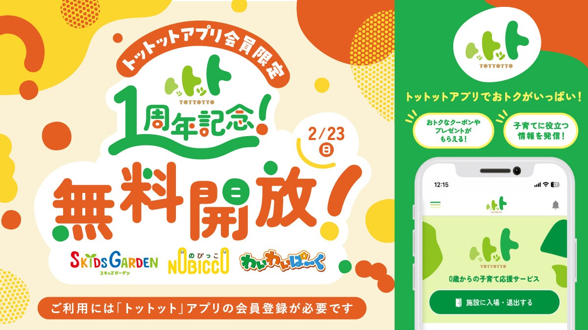子育て世代に嬉しいニュースです。株式会社イオンファンタジーが提供する子育て応援サービスアプリ「トットット」が1周年を迎えました。これを記念して、同社が運営するプレイグラウンド「スキッズガーデン」「のびっこ」「わいわいぱーく」など約200か所にて、2025年2月23日に施設の無料開放が実施されます。