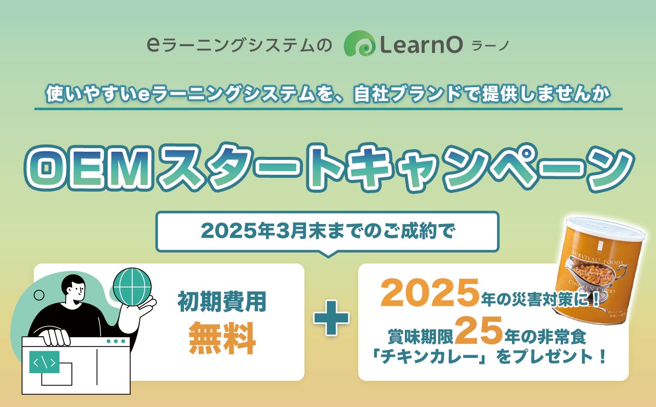 「LearnO(ラーノ)」はITが苦手な方でも気軽にスタートできるeラーニングシステム。今回のOEMスタートキャンペーンは、通常かかる初期費用が無料になるだけでなく、長期保存可能な非常食のチキンカレー1缶がもらえるというユニークな特典も付いています。2025年から自社ブランドの教育プラットフォームを始めたい企業や団体は、この機会を見逃さないようにしましょう。
